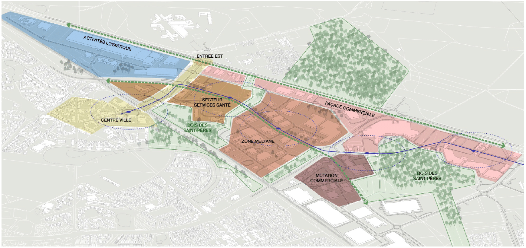 La mission a consisté à formaliser un schéma d’orientations d’aménagement, un parti pris d’aménagement et une programmation à l’échelle du périmètre d’entrée de ville, d’en définir en parallèle le contenu et les modalités opérationnelles afin, in fine, de bâtir un projet opérationnel de reconversion de cette ZI et de valorisation dans le temps permettant d’en accompagner ses évolutions. Ecologie Urbaine & Citoyenne était plus particulièrement engagé dans cette missions sur les sujets écologiques.